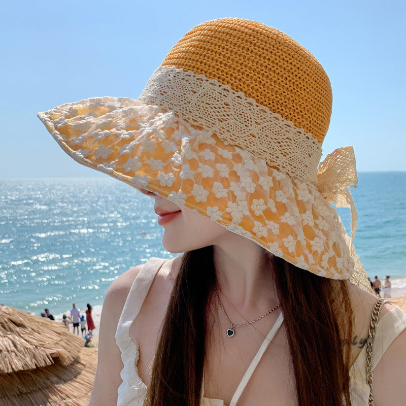 Lace Bow Straw Fisherman Hat Summer Outdoor Sunhat With Large Brim Anti-UV Sunshade And Face Protection Hat